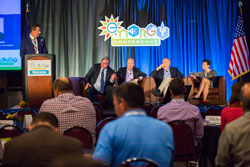 Moderator Tim Portz, BBI International, questions the Future of Fuel Policy Panel, which includes (L-R): Michael McAdams, Advanced Biofuels Association; Frank Macchiarola, American Petroleum Institute; Donnell Rehagen, National Biodiesel Board; and, Samantha Slater, Renewable Fuels Association. |